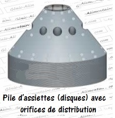 Les assiettes sont des cloisons encore appelées disques qui ont pour rôle d’augmenter la surface de séparation et de faciliter l’obtention d’un régime d’écoulement laminaire.Des perforations sont aménagées dans ces assiettes pour former des canaux de distribution du lait entier. Ces canaux coïncident avec l’interface de séparation entre les phases lourde et légère.