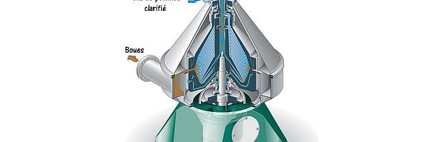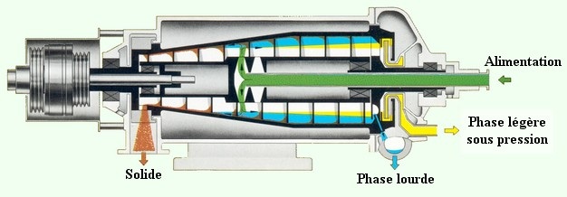Dans ce cas présent, la centrifugeuse doit séparer les deux phases liquides (lourdes et légère) d’une émulsion.