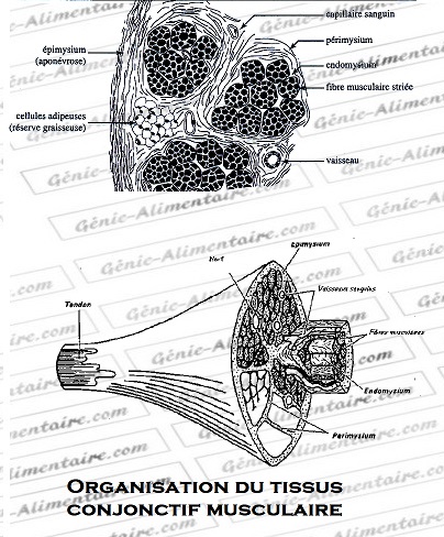 Le tissu conjonctif représente 0.3 à4% de la masse musculaire, il constitue le réseau d’armature et de soutien du muscle. Il réunit les autres tissus et les organes entre eux.