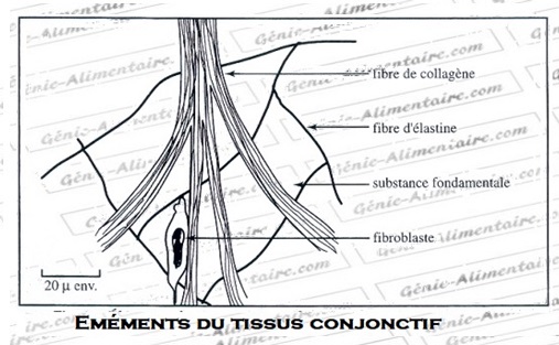 Le tissu conjonctif est constitué de cellules (fibroblaste), de fibres de collagène et d’élastine et d’une substance fondamentale.