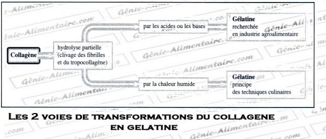 Pendant une cuisson longue en milieu aqueux (viande en ragout ou pot au feux) le collagène peut être hydrolysé en gélatine recherchée pour ses propriétés fonctionnelles et organoleptiques.