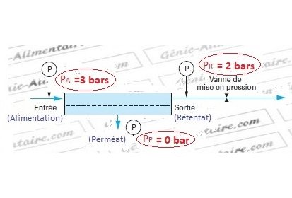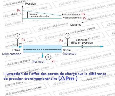 En effet en FT, du côté de l’alimentation, la pression chute entre l’entrée de l’alimentation (PA ) et la sortie du rétentat ( P R ) à cause des forces de friction due à la circulation du liquide à filtrer (on parle de perte de charge ou perte de pression).