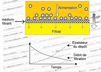 La filtration frontale, ou filtration classique consiste à faire passer le fluide perpendiculairement à la surface du filtre. Les particules à éliminer sont retenues par le medium filtrant (elles constituent le gâteau de filtration) et en le colmatant progressivement font baisser le débit de filtrat.