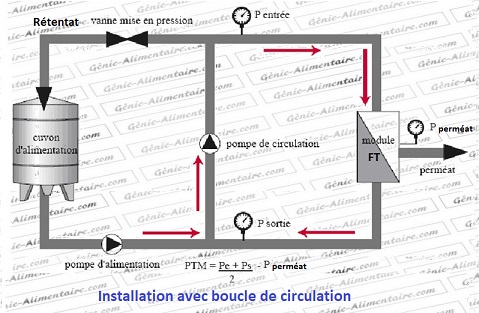 - d’une vanne de contrepression en sortie de rétentat (pour régler la différence de pression transmembranaire )
