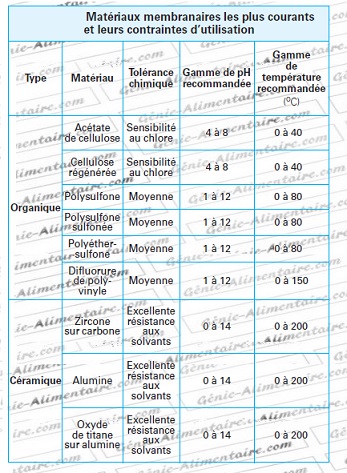 On distingue des membranes organiques (polymères organiques synthétiques) qui sont apparus en premier et qui ont pour inconvénient de ne pas bien résister aux pH extrêmes (problème pour le nettoyage) ni à des températures élevées (pas stérilisables).