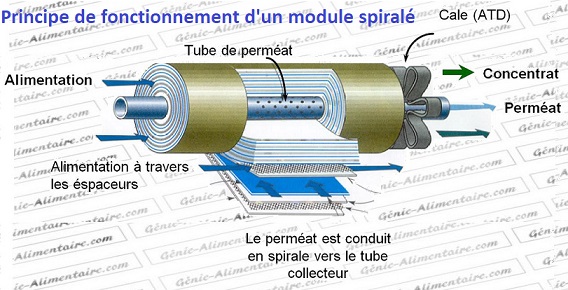 - module spiralé membranes composées d’un matériau organique. Elles sont très utilisées pour la nanofiltration. Les modules sont composés d’un tube sur lequel sont enroulés successivement une membrane, une grille fine, une autre membrane et une grille plus grossière. Les membranes doivent donc être suffisamment flexibles pour être enroulées. Le rétentat circule à travers la grille moins fine tandis que le filtrat va aller jusqu’à la grille plus fine où il passera dans le creux central du tube.