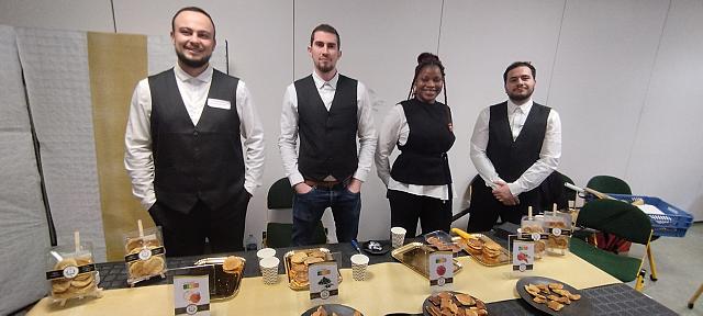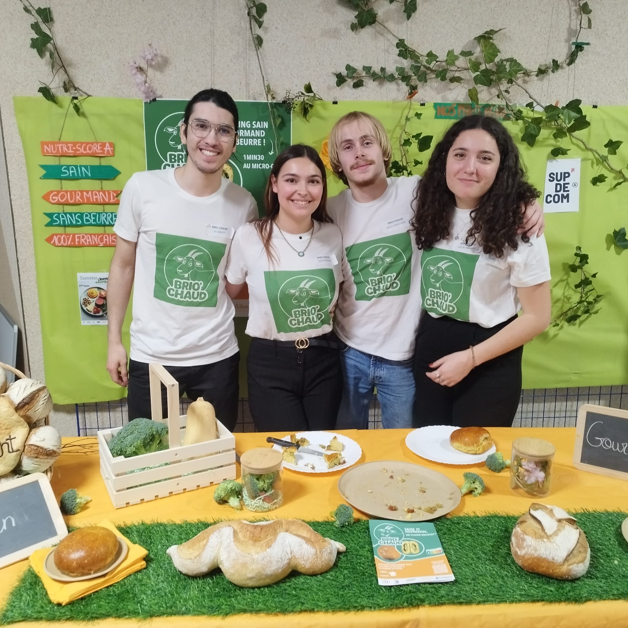 Brio’chaud : Ce projet est présenté par une équipe de BUT3 de l’IUT Lyon 1 Cassie, Léo, Lyane et Mathis nous ont présenté une spécialité boulangère salée fourrée à la purée de brocolis et au fromage de chèvre.L’innovation tient au fait que cette « brioche » ne contient pas de matière grasse ajoutée, c’est pour cette raison qu’elle est notée A sur le « Nutriscore » !Le beurre a été remplacé par du « Potibon » qui est un produit créé par une startup à partir de butternut pour ressembler au beurre !Notez que ce projet a aussi remporté le prix Bac + 3Quel délice et quelle présentation !