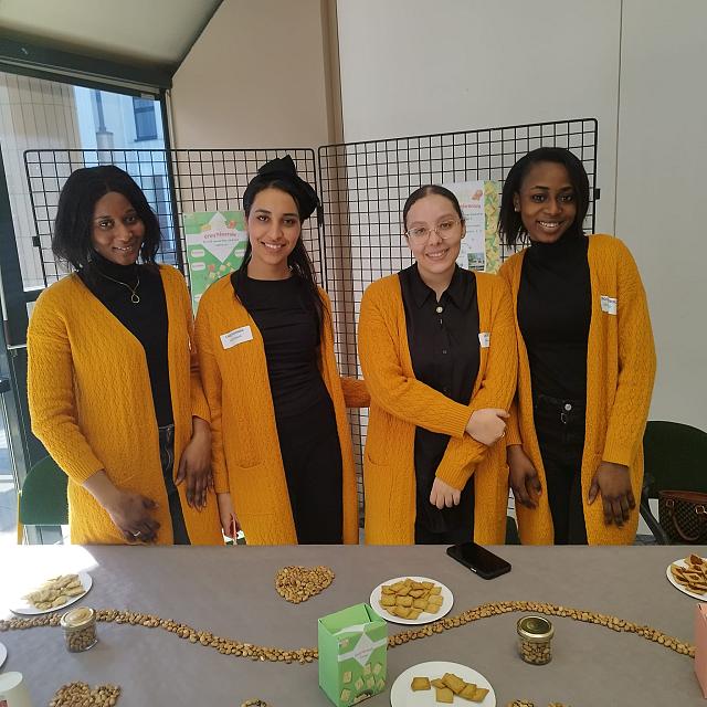 « Croq’Féveroles » : Ce projet est présenté par une équipe de BTS STA du Lycée des Sardières de Bourg en B Ma Aby, Bénie, Ayat et Aicha nous ont concocté des petits biscuits apéritifs riches en protéines végétales et écologiques.Ces biscuits apéros ont une faible emprunte carbone car riche en légumineuses locales (féveroles) et intéressantes au niveau nutritionnel puisque riches en protéines !
