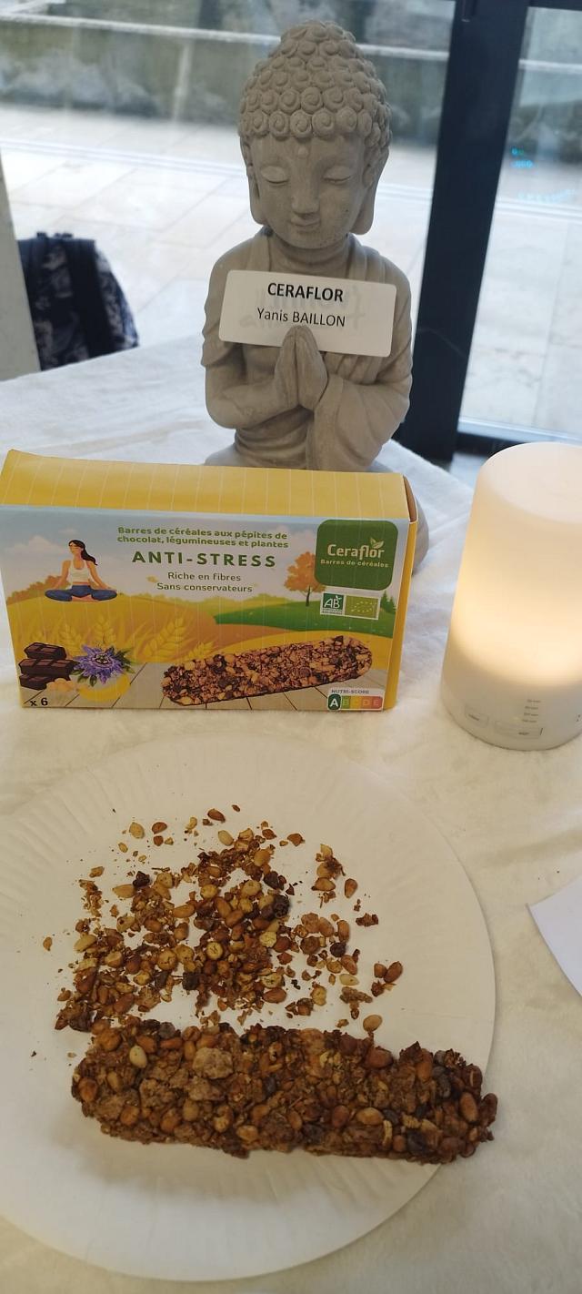 « Céraflor » : Ce projet est présenté par une équipe de BUT3 de l’IUT Lyon 1 de Bourg en B. Killian, Flavie, Yanis et Lou-Anne nous ont présenté Céraflor.« Céraflor » est une barres de céréales antistress. Cette propriété est conférée grâce à l’ajout de passiflore et de verveine.